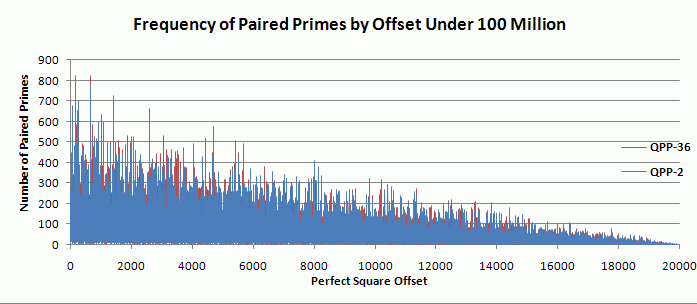 The following graph looks at the frequency of paired primes by offset for all numbers under 100 million. The graph shows data for two intervals: QPP-2 and QPP-36 are superimposed, showing the closeness of the distribution for each one.