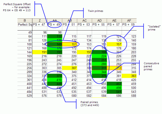 - Only the subset of paired primes for even perfect squares with odd offsets are demonstrated.