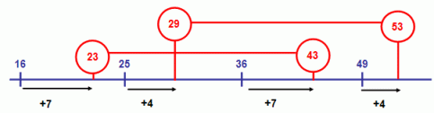 Notice the common difference, or offset, between the primes of each pair and their preceding perfect squares: 23 and 43 have an odd offset of 7 from even perfect squares 16 and 36; 29 and 53 have an even offset of 4 from perfect squares 25 and 49.